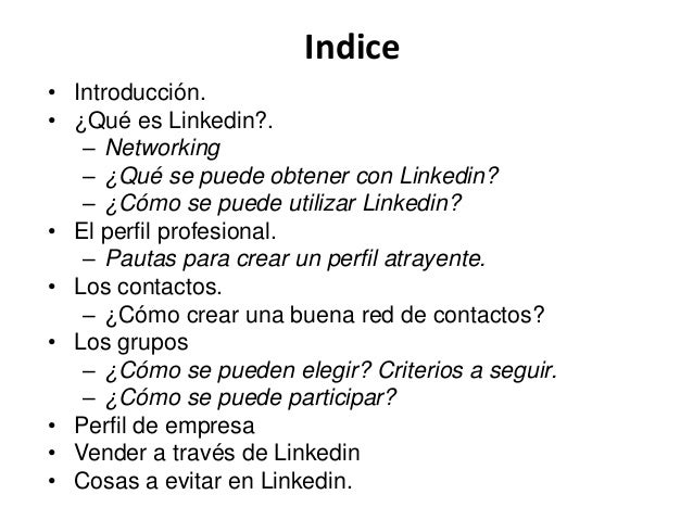 - 2. Indice • Introducción. • ¿Qué es Linkedin?. – Networking – ¿Qué se puede obtener con Linkedin? – ¿Cómo se puede utilizar Linkedin? • El perfil profesional. – Pautas para crear un perfil atrayente. • Los contactos. – ¿Cómo crear una buena red de contactos? • Los grupos – ¿Cómo se pueden elegir? Criterios a seguir. – ¿Cómo se puede participar? • Perfil de empresa • Vender a través de Linkedin • Cosas a evitar en Linkedin.